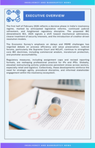 The first half of February 2026 marks a consequential phase in India’s insolvency and restructuring landscape, characterised by anticipated legislative reforms, evolving judicial reasoning, and heightened regulatory discipline. This edition of the AIPE Newsletter captures the emerging policy direction and its practical implications for creditors, insolvency professionals, and market participants.