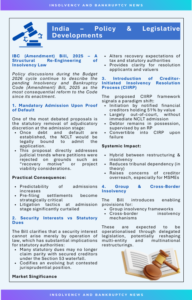 Recent developments signal a broader structural shift within the insolvency framework. The proposed reforms under the Insolvency and Bankruptcy Code (Amendment) Bill, 2025 emphasise greater predictability in admissions, clearer treatment of security interests, and the increasing prominence of creditor-initiated resolution models. Judicial forums continue to reinforce core IBC principles, particularly procedural discipline, commercial wisdom, and value preservation.